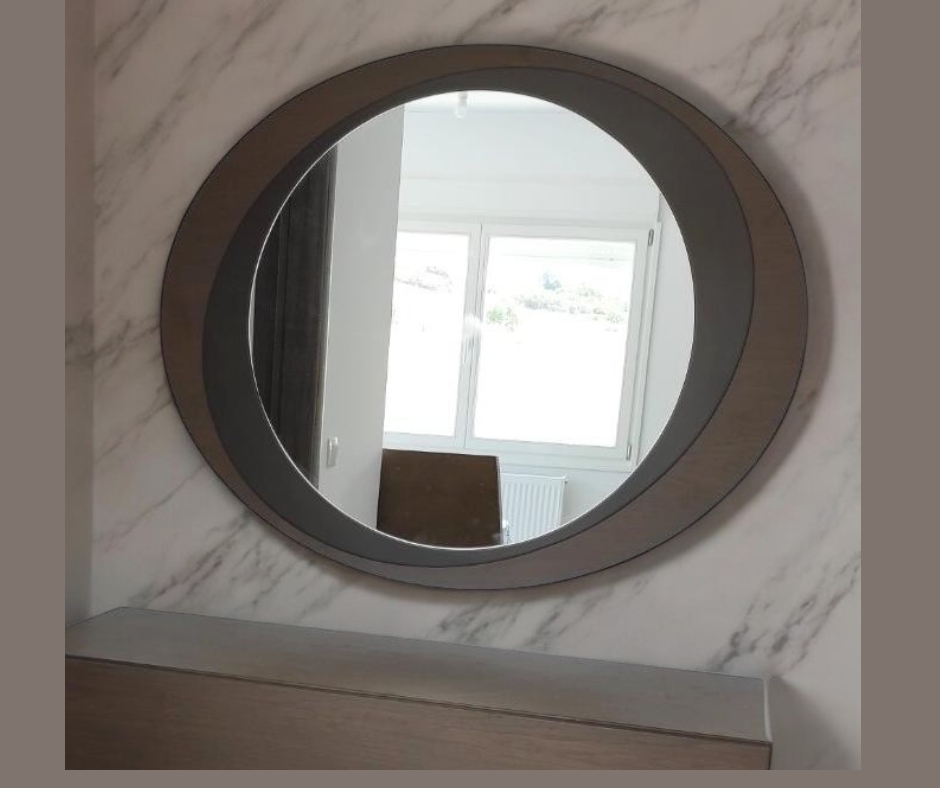 Μοντέρνος στρογγυλός καθρέφτης κονσόλας με ξύλινο πλαίσιο. Διάσταση: Φ100. Η διάσταση δύναται να διαφοροποιηθεί κατόπιν επικοινωνίας.